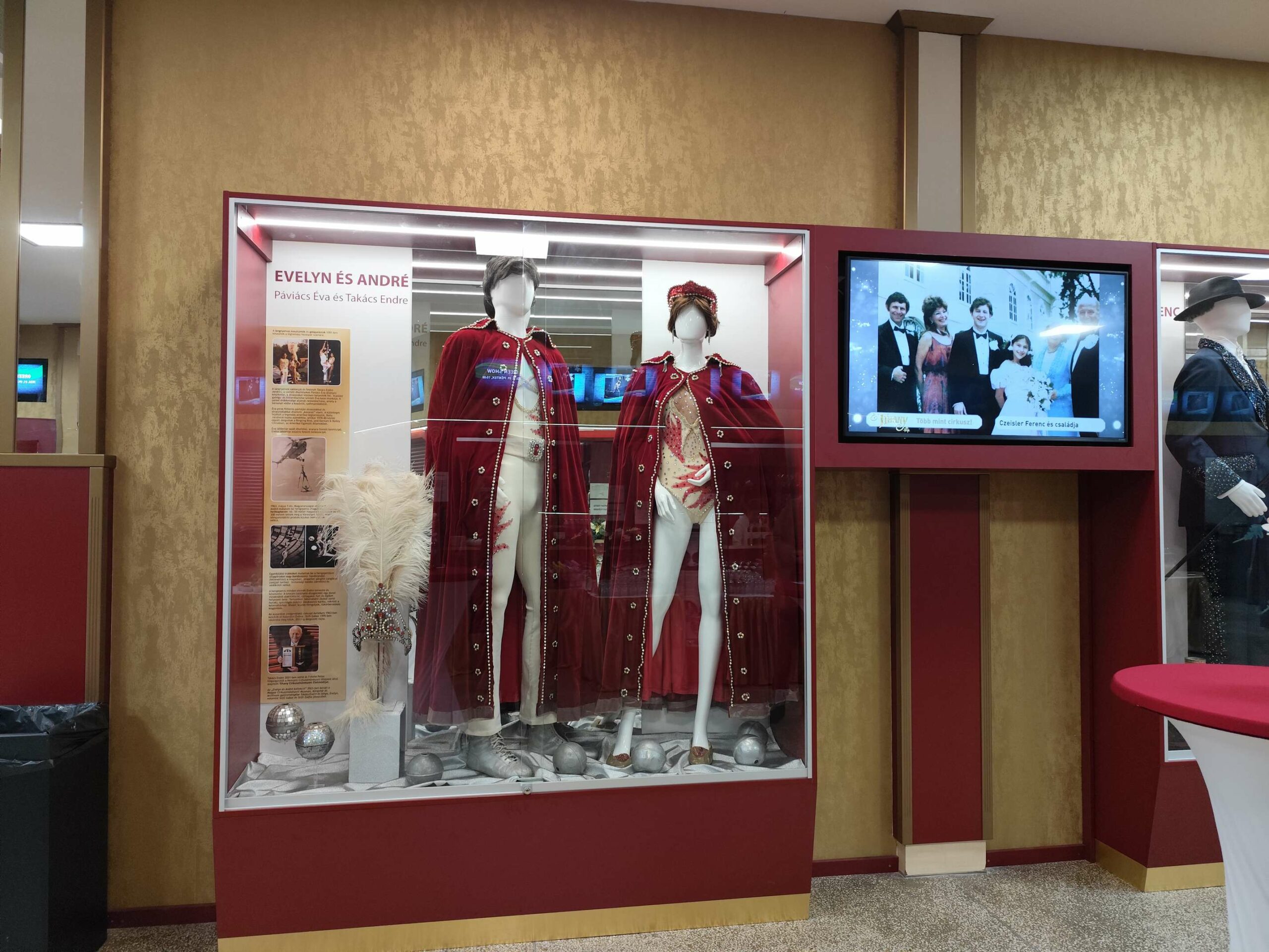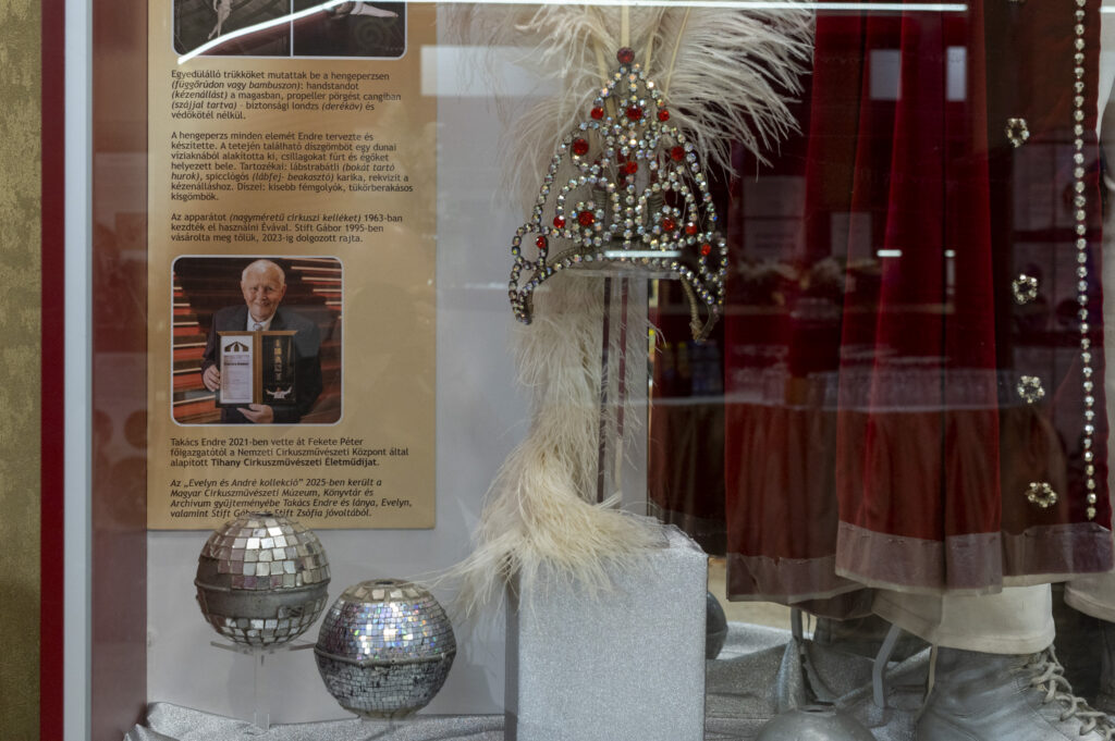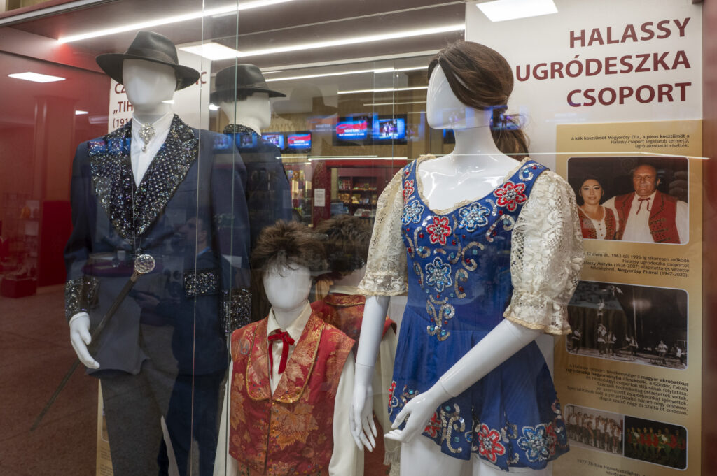Új műtárgyvitrinjeinkben további újabb szerzeményeinket mutatjuk be: Páviács Éva és Takács Endre (Evelyn & André) gála-kosztümeit, Czesiler Ferenc Tihany alakjához kapcsolódóan egy díszdobozos, a 90. születésnapjára kiadott Tequilát, valamint a Halassy ugródeszkacsoport válogatott kosztümeit.