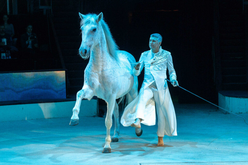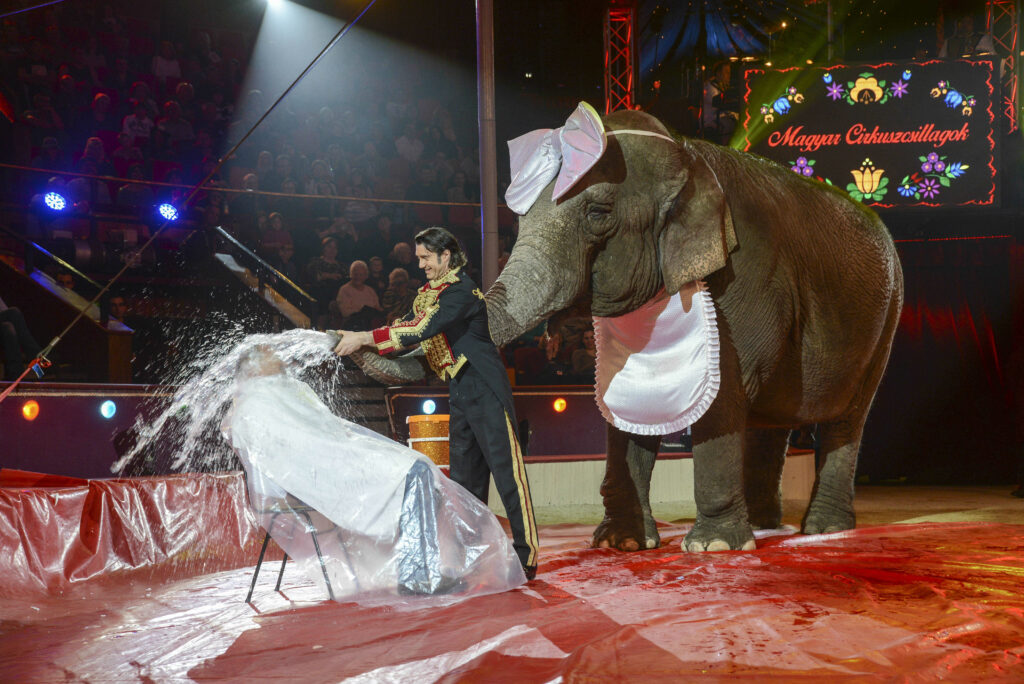 Mégis: az idomított állat mozgása egyszerre kelti az ellenállás és a harmónia érzetét. A néző figyeli, ahogy az elefánt ormányával köröz, miközben idomárja hasonló mozdulatot tesz a karjával – a két test között feszültség és összhang egyszerre van jelen.