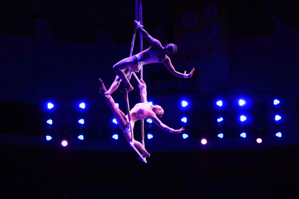 Xishui County Acrobatic Troupe lábzsonglőr, tányérpörgetés, dupla trapéz