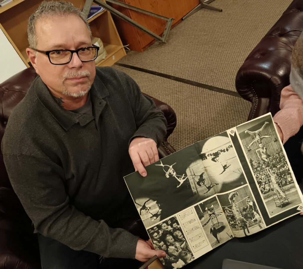 A főképen Fedák Antal kezében egy japán magazinnal, amelyben a Simon testvérek fellépéséről is beszámoltak. Forrás: Magyar Cirkuszművészeti Múzeum, Könyvtár és Archívum